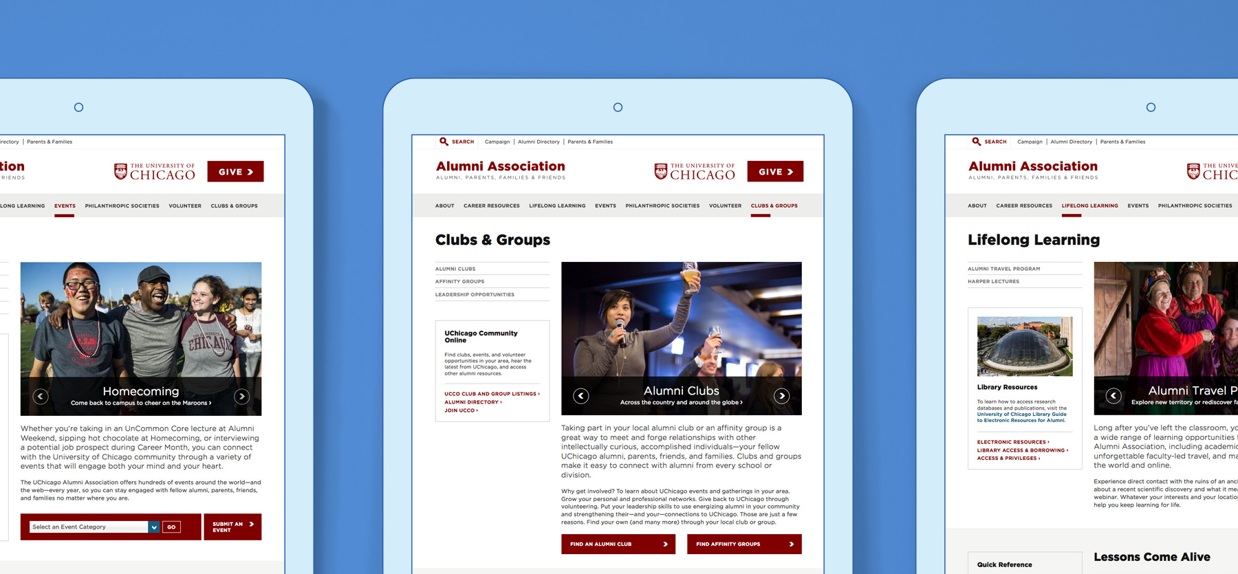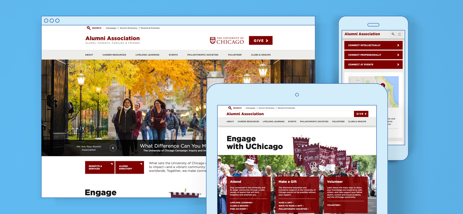 Once embedded, we provided strategic guidance by assessing their audience, content efficacy, and information architecture to bring the site to life. The force behind the new design direction for Alumni & Friends was a desire to provide an engaging resource for alumni while employing the common elements of a separate University campaign with a similar launch date.