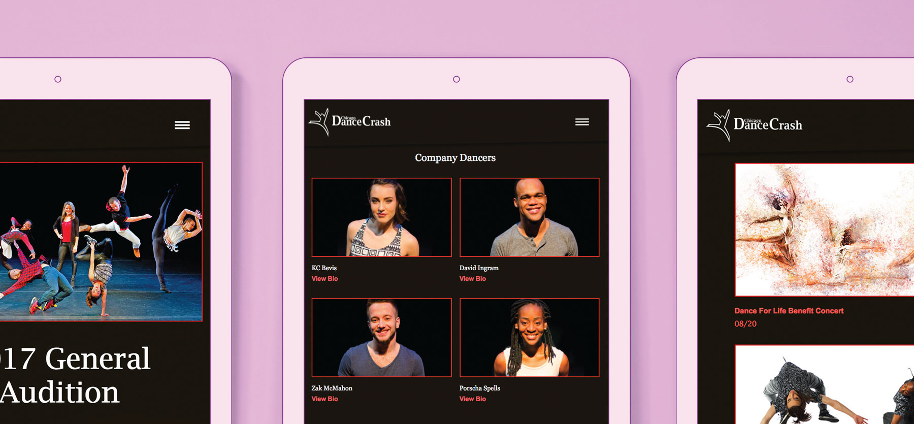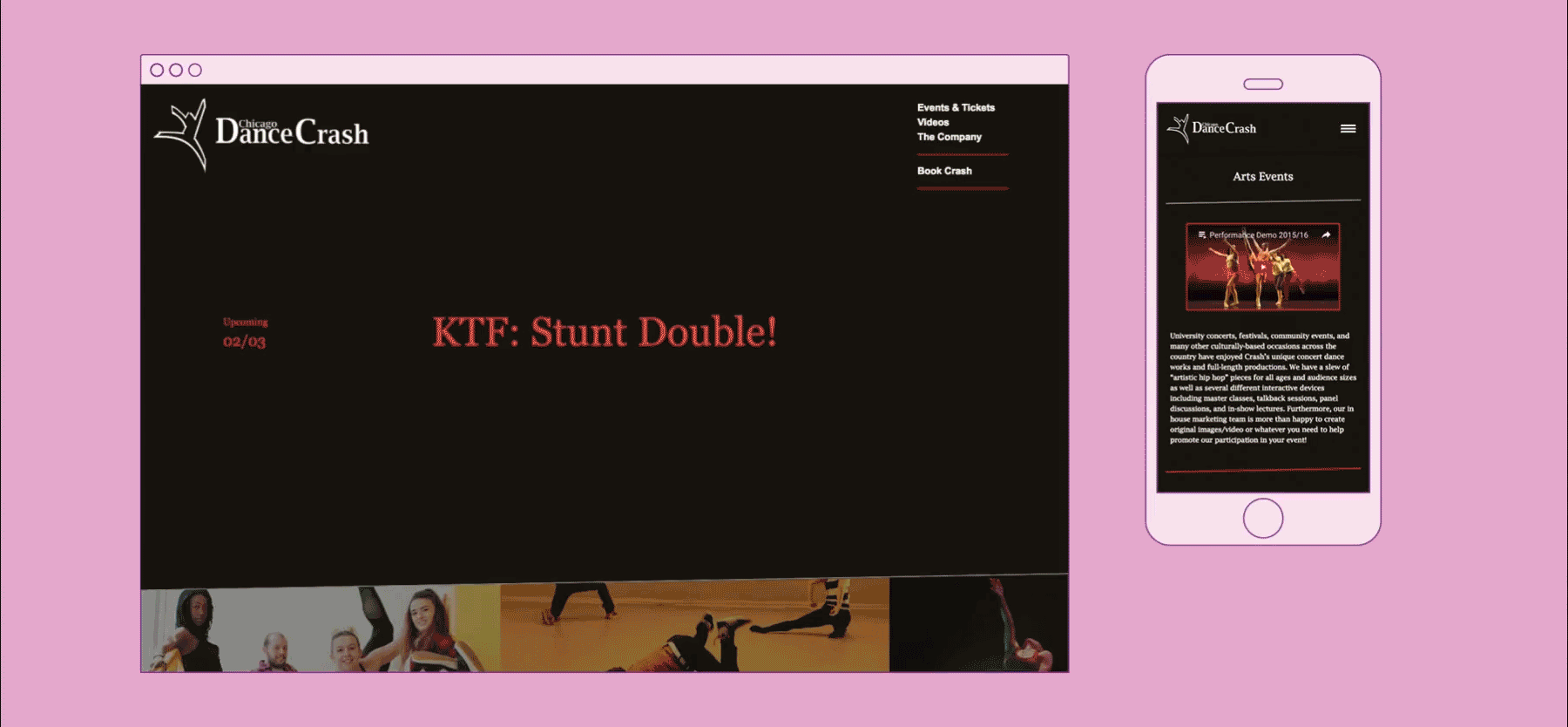 We created a website true to their daring, no nonsense style that serves as a window into their talents. Chicago Dance Crash may very well be the most exciting dance company in the Midwest — a contemporary dance group that fuses athleticism with hip-hop influences.