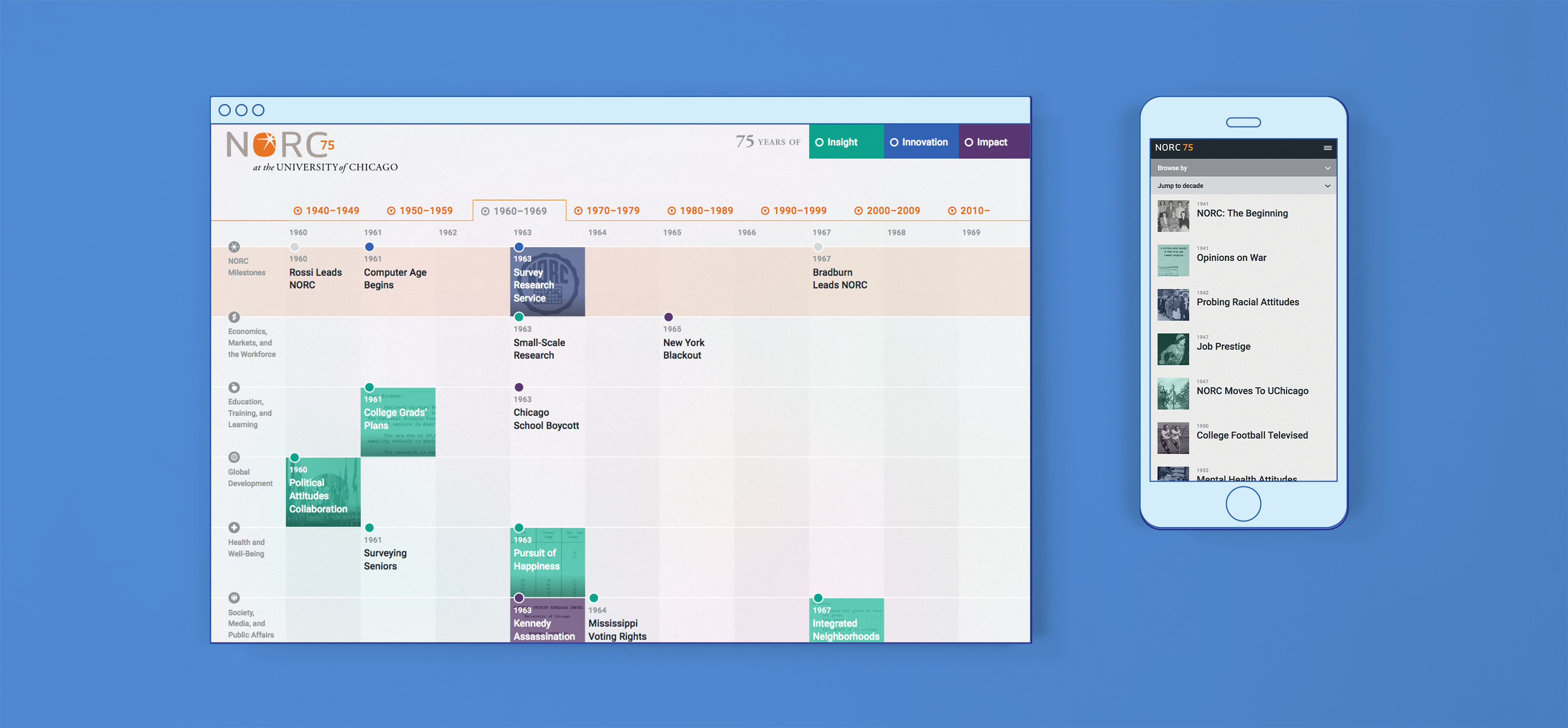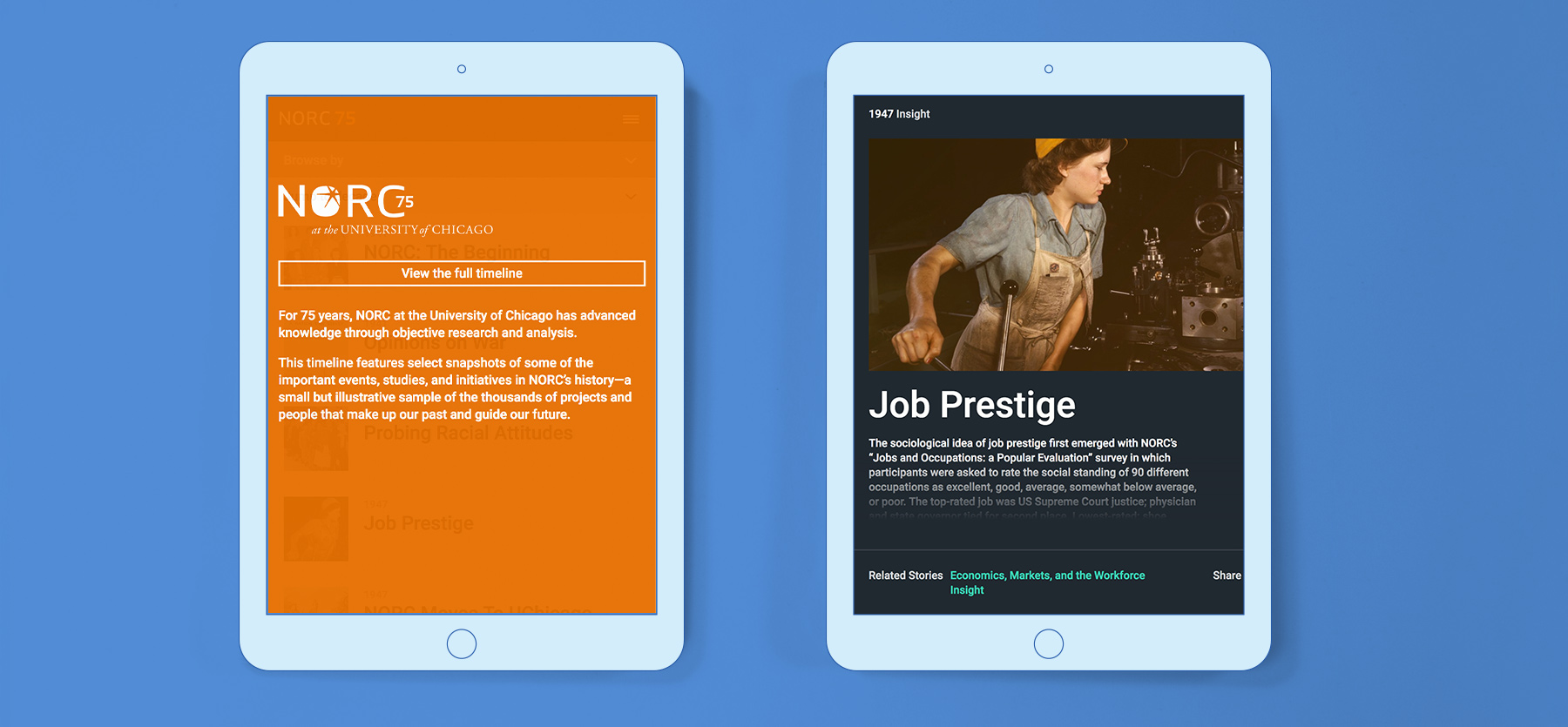 This custom app was translated to the web, mobile and interactive kiosks placed in NORC's three office locations.